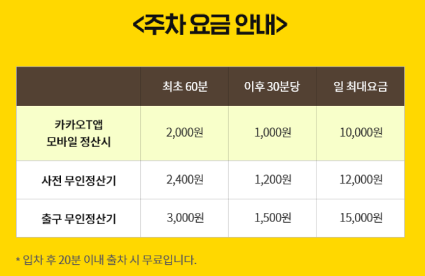 주차요금은 카카오T앱으로 정산시 일 최대 요금은 10,000원이고, 사전 무인정산기로 정산시 12,000원, 출구 무인정산기 이용시 15,000원이 부과됩니다.