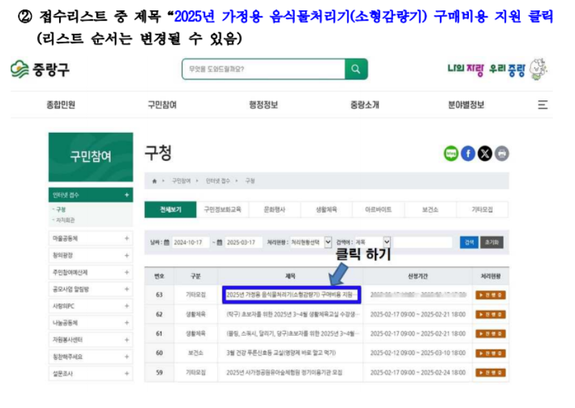 | 가구주 | 중랑구에 거주하는 만 19세 이상 성인, 타 기관 미지원 | 가구당 1대 처리기 구매비용의 최대 50% 지원 |