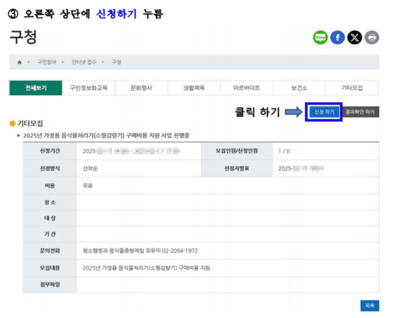 구청 공식 홈페이지 내 ‘지원사업’ 또는 ‘복지/환경’ 메뉴에서 ‘음식물처리기 지원금 신청’을 선택합니다. 개인정보 및 주소, 신청 가구 구성원 정보를 입력한 후, 음식물처리기 제품 정보(제조사, 모델명, 구매 금액 등)와 구매 영수증을 파일 첨부 형식으로 등록합니다.